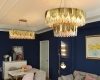 Mẫu đèn chùm pha lê vô cùng rực rỡ và sang trọng. Đây là thiết kế rất được ưa chuộng hiện đại. Bên cạnh các hạt pha lê phản xạ ánh sáng lấp lánh dưới ánh đèn, chiếc đèn chùm còn có điểm nhấn là khung thép được xi màu vàng 24K óng ánh. Mẫu đèn đặc biệt thích hợp sử dụng cho phòng khách, và cũng rất lộng lẫy cho phòng ăn, phòng ngủ hay nhiều vị trí khác…