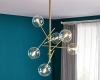 Đèn chùm thủy tinh 6 bóng sử dụng sử dụng chao đèn thủy tinh trong suốt, mang lại vẻ long lanh cho căn phòng. Chiếc đèn còn có thân đèn màu vàng óng làm điểm nhấn tuyệt vời.